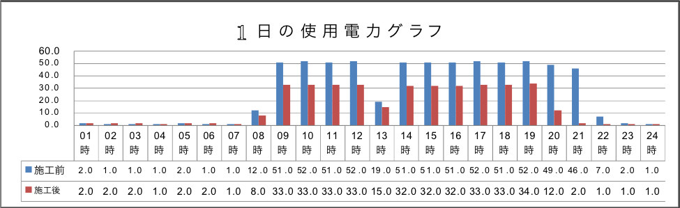 | 今回は、器具台数を 102台 → 66台 へ大幅削減!! 削減しても照度は、約1.5倍〜3倍へ照度アップを可能にしました。 作業環境改善にも大きく貢献しています。 下記のグラフを見て頂くと、使用電力が現実に減っている事が明確に出てます。 消費電力削減と同時に二酸化炭素も削減でき、環境問題にも大きく貢献できます。 また、エネルギー指定工場やISO取得工場など地球環境や工場内環境改善のお役に立てます。 |