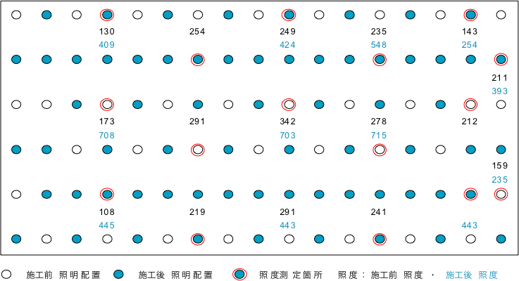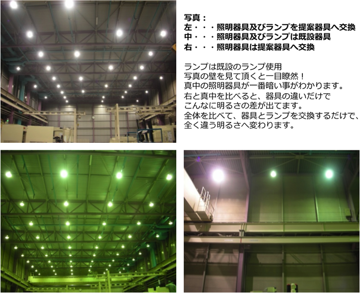 | ■左写真/既設照明:102台(HF400W) ■右写真/提案照明:66台(MF360W) 一般メーカー照明器具(HF400W:102台)→ AXIS照明器具(MF360W:66台)に変更する事で、消費電力約41%削減 |